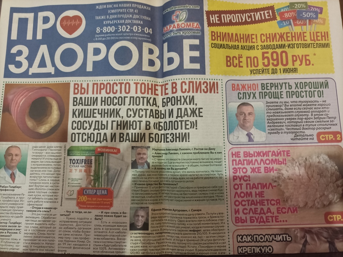 Многие в своих почтовых ящиках находят бесплатную газету "ПроЗдоровье", которую периодически туда раскладывают. И многие ее читают. Между тем, Роспотребнадзор официально предупредил об опасности чтения этой газеты. Как разъяснили в Роспотребнадзоре данная "газета" содержит недостоверную рекламу и вводит людей в заблуждение. В газете постоянно идет реклама различных чудо-препаратов, которые комментируют никому не известные врачи и эксперты. Как отметили в Международной ассоциации «Антиконтрафакт» все упоминаемые в газете врачи-эксперты, являются вымышленными персонажами. В газете частенько печатают отзывы "счастливчиков", которые испробовали на себе различные чудодейственные средства. А между тем, рекламируемые препараты не только не являются лекарствами, но и могут нанести непоправимый вред здоровью смельчаков, решивших испытать действие препарата на себе. Человек купивший такое "лекарство" не только потеряет деньги, но и упустит драгоценное время, потратив его на "ложное" леч