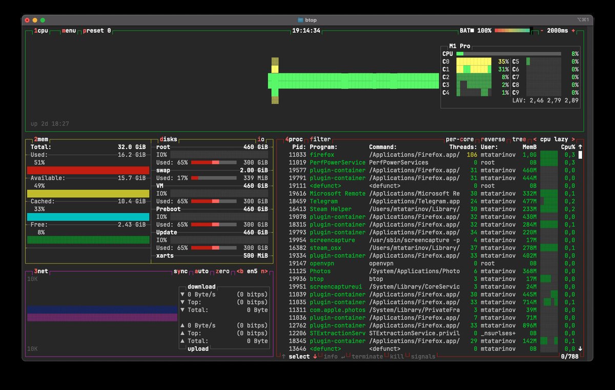 оперативной памяти, дисковом пространстве, сетевых соединениях и др.. brew install btop После установки вы можете запустить btop++ просто введя команду в терминале: btop