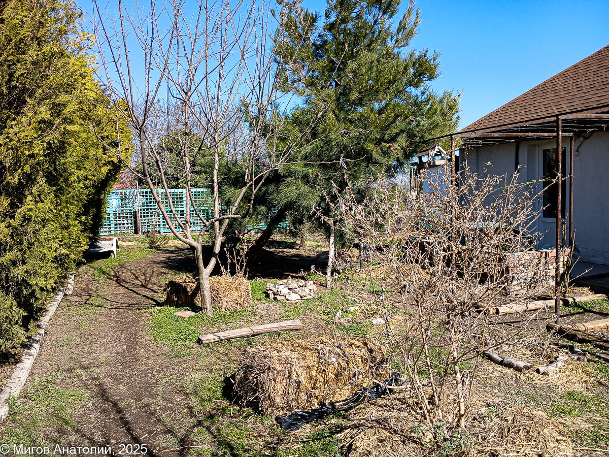 Не успел снег растаять, а земля в саду уже просохла. Три дня тепла и яркого солнца, и вот результат. Последнее воспоминание о суровой крымской зиме-2025 можно найти только у забора, где большая часть дня стоит тень. Там у нас целая плантация галантусов. Это самые ранние крымские первоцветы. Настоящие подснежники, которые начали цвести 9 января, через месяц легли придавленные метровым слоем снега, пережили месяц зимы с 12-градусными морозами, а теперь снова цветут как ни в чем не бывало. Кизил тоже собрался зацвести ещё в январе. Уже набухли цветочные почки. Но пришла зима, и он передумал. А вот теперь для него самое время. Цветочки у кизила крохотные, но яркие. В каждой цветочной почке много крохотных жёлтых лепестков. В центре снимка (на фото ниже) куст розмарина. Он у нас был побольше, но год назад слегка подмёрз. Тогда зима вернулась в марте, морозы держались две недели. А розмарин вообще холодов не любит. Однако изрядная часть куста выжила и нынешнюю зиму пережила. Меня уже спраш