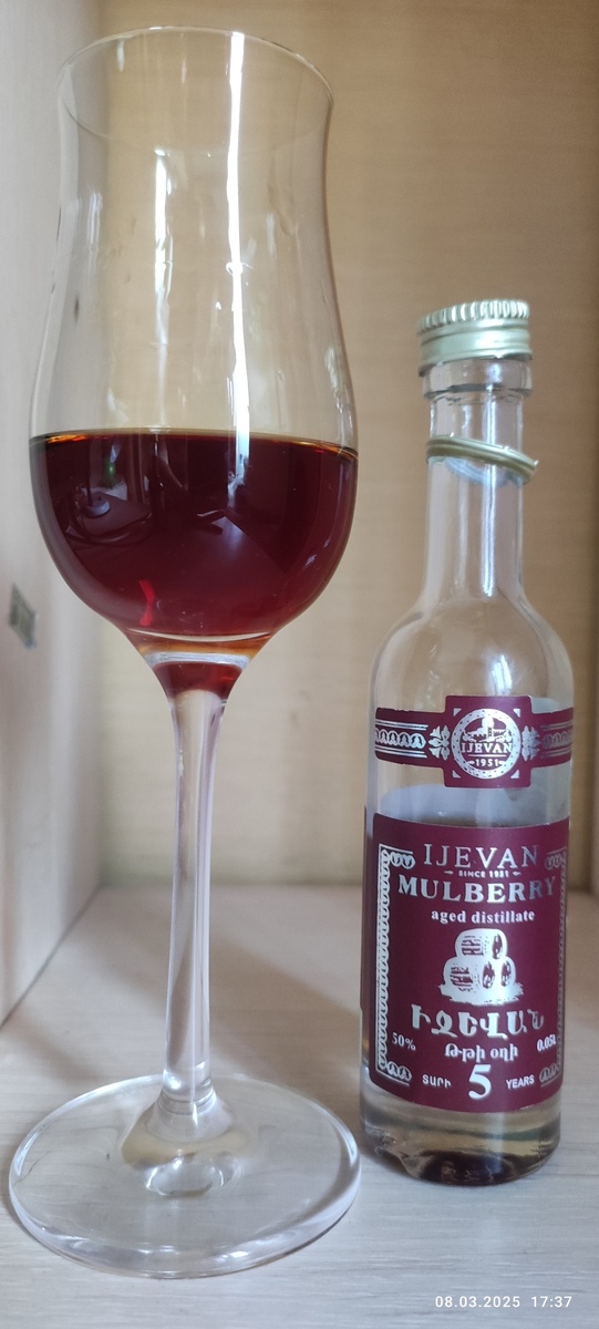Всем привет от меня, КОньячного Маньяка и наших друзей! Продолжаю знакомство с иджевановскими дистиллятами. Стараниями Бориса я подошёл к тяжёлой артиллерии: выдержанным тутовкам! Первой пойдёт пятилетка. Состоит она из спирта ягод туты тройной очистки и воды. В описании на контре дан минимальный возраст дистиллятов 5 лет, и никакого намёка на то, ГДЕ или в ЧЁМ были выдержанны эти дистилляты! В бочке, в кувшине, в трёхлитровых банках или бутылках из под кулера?! С таким я сталкиваюсь впервые, и что думать даже не предполагаю. Пришлось лезть на офсайт, который успокоил меня сей информацией: Водка изготовлена по старинному рецепту из ягод белоплодной шелковицы (тут) при помощи тройной дистилляции и выдержке в дубовой бочке. Уф, прямо от сердца отлегло. Видимо, на контре два лишних слова не поместились. Крепость стандартная, 50%, розлив 06.23 Цвет очень красивый и насыщенный! Переливается всеми тёмными и красными ягодами, да и маслянистость на уровне. Глазу приятно! Аромат солидный, сраз