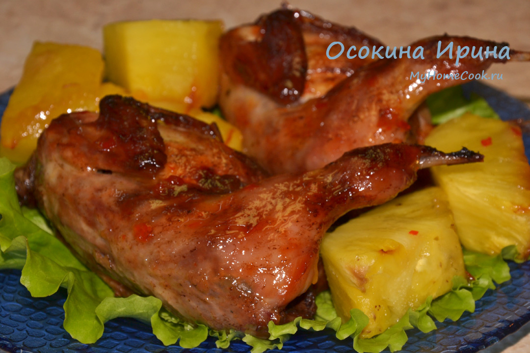 Сегодня у нас девочковое блюдо, поэтому ничего лишнего, "тяжёлого" и чрезмерно сытного: 4 перепёлки разморозила, промыла, обсушила и натёрла солью. В миске смешала 3 ст.л. сладкого соуса чили, 1 ст.л. лимонного сока, 1 ст.л. растительного масла и промешала, добавила перепёлок, промешала, оставила мариноваться на часик, затем переложила в форму, смазала остатками маринада, положила форму в пакет для запекания, завязала его и запекла всё в духовке, разогретой до 180 градусов, в течение 50 минут, достала форму, сняла пакет, перевернула перепелов, обложила кусочками свежего ананаса и вернула форму в духовку ещё на 15 минут. Сочно и огненно-вкусно) Приятного аппетита