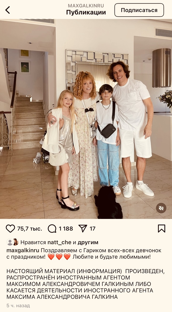 Муж Примадонны сегодня поздравил «девчонок» с Международным женским праздником (в запрещенной у нас социальной сети):