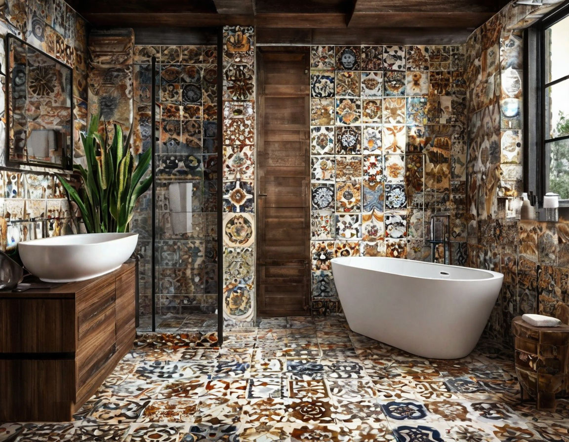 В маленькой ванной: мозаичная плитка + вертикальные деревянные панели (визуально «вытянут» стены). - Акцент на одной зоне.