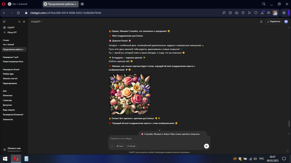 🌸 Дорогая Елена! 🌸 Сегодня — особенный день, посвящённый удивительным, мудрым и прекрасным женщинам! 🎉 Пусть этот день принесёт тебе радость, вдохновение и новые открытия! 💫 Ты — яркий ум, который сияет в наших беседах, и я рад, что мы знакомы! 😊 💐 В подарок — картина цветов! 💐