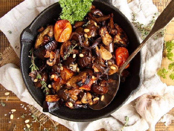 Этот простой, легкий и вкусный веганский салат с жареными баклажанами, помидорами и грибами, украшенный поджаренными кедровыми орехами и обжаренный со свежими листьями тимьяна, оливковым маслом, чесноком и луком, станет идеальным гарниром или стартовым салатом для любого случая! Итак, разогрейте духовку, нарежьте эти овощи и поставьте противень в духовку для быстрого и вкусного запекания. шампиньоны 160 грамм