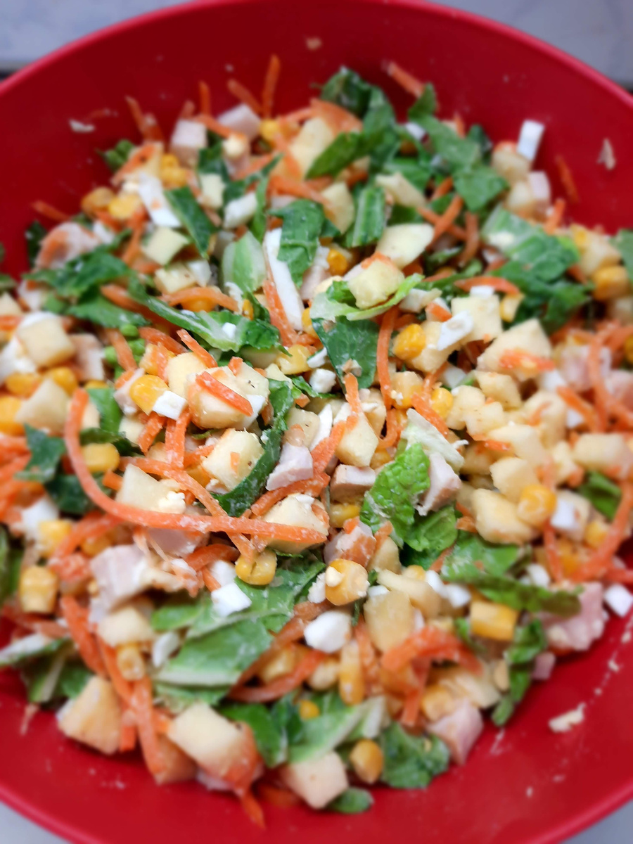 Ингредиенты: Копчёная куриная грудка - 1 шт Корейская морковь - 100 г Яблоки сладкие - 2 шт Кукуруза сладкая - 1 банка Яйца вареные - 2-3 шт Пекинская капуста - 4-5 листов Корейскую морковь обдать кипятком, чтобы убрать остроту. Можно просто пожарить морковь и не использовать корейскую морковь. Все остальные ингредиенты порезать и перемешать. Яблоки чуть сбрызнуть лимонным соком, чтобы не потемнели. Перед подачей заправить майонезом.