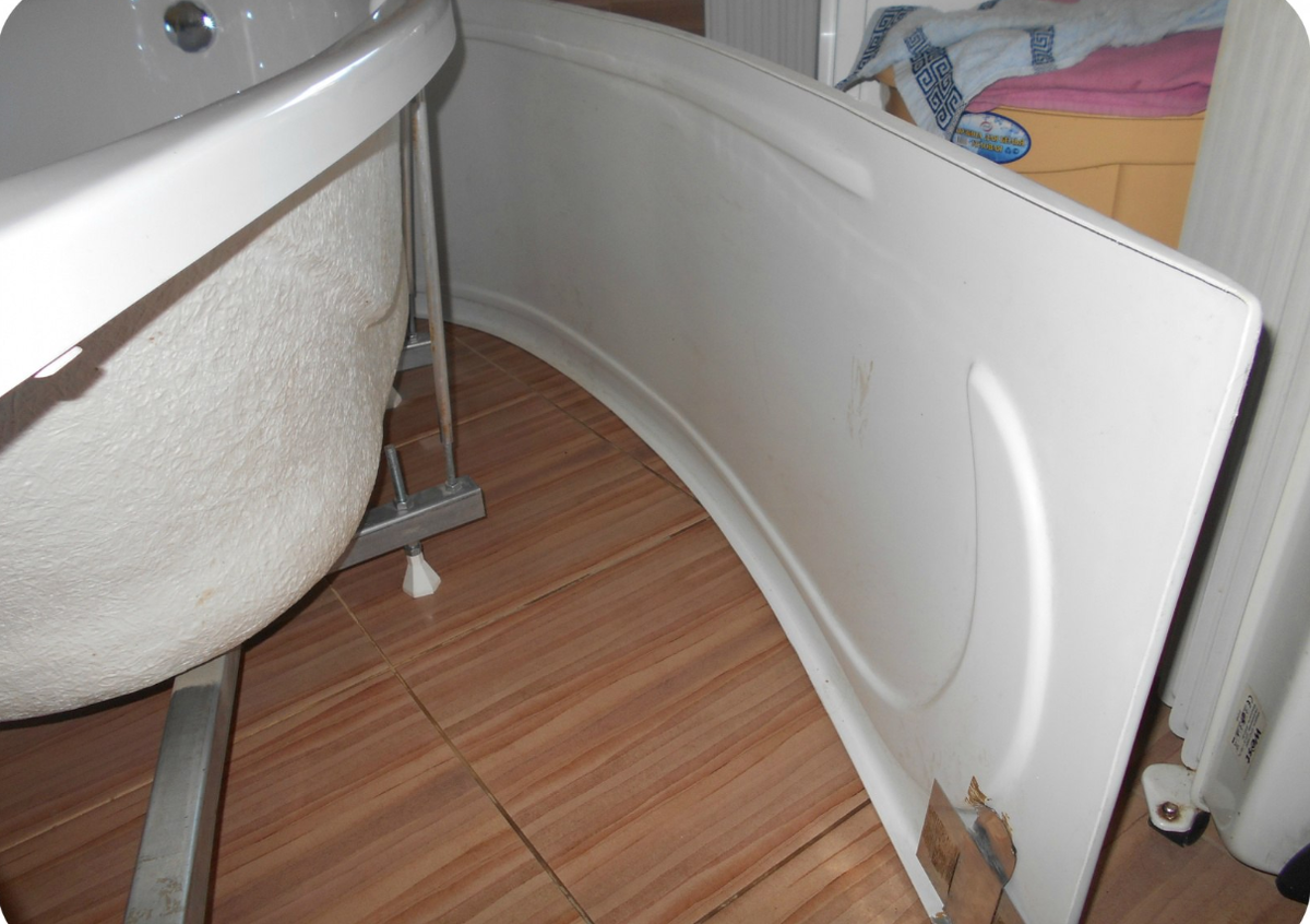 Визуально это выглядит небольшими, еле заметными волнами на поверхности ванны. Если ткнуть в такую волну пальцем, то заметно, как она прогибается на миллиметр другой. Снизу, металлический крепёж, который держит декоративный экран начинает "хлябать", как будто он отошёл от чего-то жёсткого внутри стенки. А сами борта ванны начинают сильнее прогибаться, если на них опереться рукой и не дай бог сесть тем, чем люди садятся.
