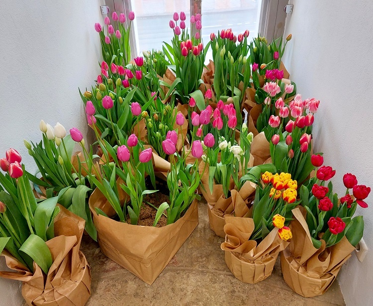 «Масленица — связующее звено, граница между зимой и весной, когда изгоняли, хоронили зиму [старуху Морену, богиню мрака] и встречали весну несущую свет, тепло, пробуждение природы» /Соколова В.К. «Весенне-летние календарные обряды славян». Академия наук СССР/. Зиму, конечно, прогоняли, но ушла она недалеко. Поэтому вид со смотровой площадки на Думской башне так себе или «типично Петербургский». Однако, 233 ступени [47 метров] подъема мы преодолеваем в сплошной красоте. Второй год одно из цветочных хозяйств Ленинградской области украшает башенное пространство тюльпанами, самыми прекрасными весенними цветами. Фестиваль «Весна на высоте» проходит в начале марта и приурочен к Международному женскому дню. Все стенные ниши, площадки лестничных пролетов, подоконники заполнены знаменитыми луковичными. Цветок тюльпана само совершенство, символ духовности и гармонии. Классический бутон подчинен законам симметрии: в венчике три внешних + три внутренних лепестка; три доли завязи; шесть тычинок. С