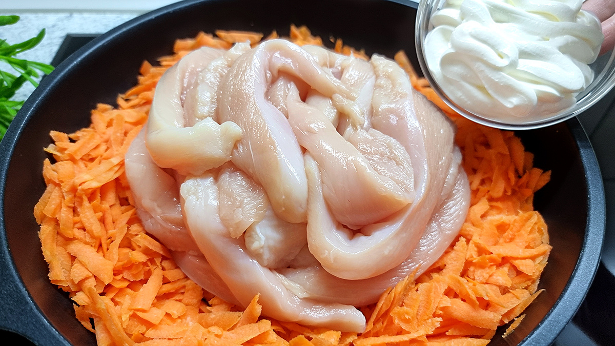 Это невероятно вкусное блюдо из куриной грудки. Однажды попробовав приготовить куриные грудки по этому рецепту, вы будете готовить его снова и снова. Моя семья в восторге от такого ужина! Ингредиенты: 500 г куриного филе; растительном масло; 1 луковица; 1 столовая ложка муки; ~ 300 г грибов; 1 морковь;