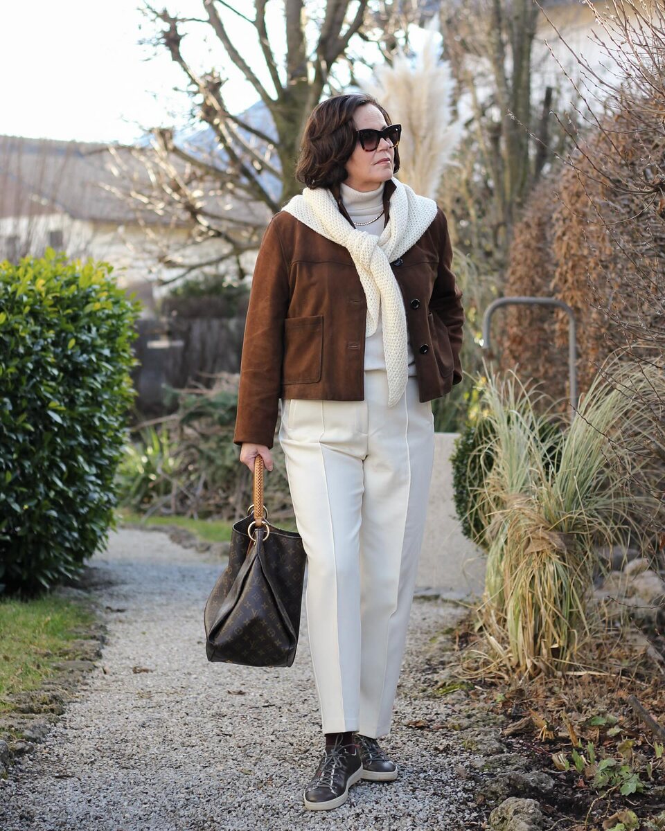 Тренд на многослойность особенно актуален весной, когда погода не отличается стабильностью. Как создать стильный и при этом комфортный образ? Ниже 10 готовых идей для дам старше 50. Куртка + водолазка + брюки со стрелками + кеды – универсальная формула на весну. Каждый слой добавляет глубину и детали, которые хочется рассматривать. Модницы часто вписывают футболку в многослойные сеты. Ее можно носить с джемпером или свитером, жакетом, кофтой. Бежевые брюки сидят свободно, не стесняют движений. Кожаные брюки – смело, свежо и небанально! Матовая ткань легко подружится с трикотажем, а также с плюшевыми фактурами. При составлении весеннего наряда уделите должное внимание цвету. Так, одежда и аксессуары в розовых тонах, особенно в тандеме с нейтральным бежем, выгодно омолаживают внешность женщины. Современные леди 50+ не забывают о таком модном приеме, как сочетание фактур. Ниже мы видим комби белой футболки, молочных брюк, кожанки и пальто. Важно, чтобы все детали комплекта были сдержанног