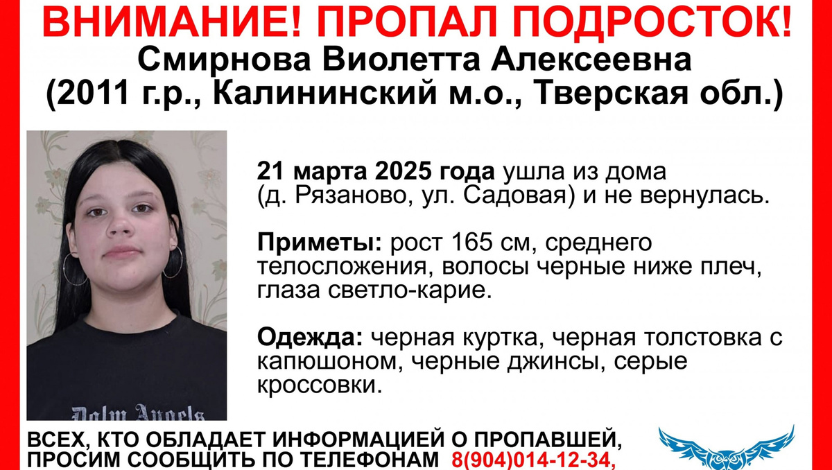 В Калининском районе Тверской области пропала 14-летняя Виолетта Алексеевна Смирнова. Как сообщает тверской волонтерский поисково-спасательный отряд "Сова", 21 марта девочка ушла из дома в деревне Рязаново и не вернулась. Приметы: рост 165 см, среднего телосложения, волосы черные ниже плеч, глаза светло-карие. Одежда: черная куртка, черная толстовка с капюшоном, черные джинсы, серые кроссовки.©ТИА Волонтеры просят сообщать информацию о пропавшей по телефонам: 8 (910) 646-34-34 и 8 (904) 014-12-34©ТИА
