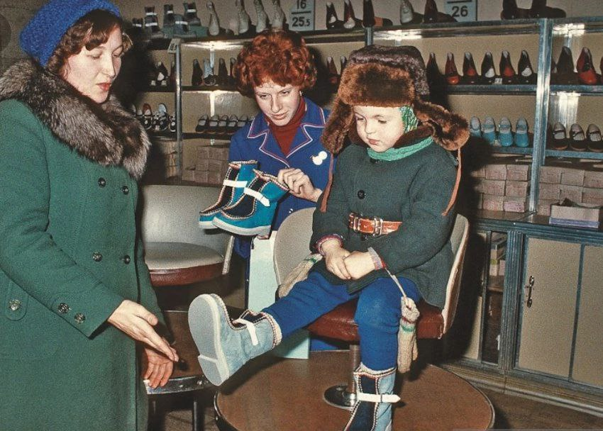 В советских обувных магазинах 70-х годов разворачивались настоящие драмы повседневности. Покупатели терпеливо изучали ограниченный ассортимент, пытаясь найти подходящую пару среди типовых моделей. Продавцы, вооружившись деревянными рожками, помогали примерять дефицитный товар.