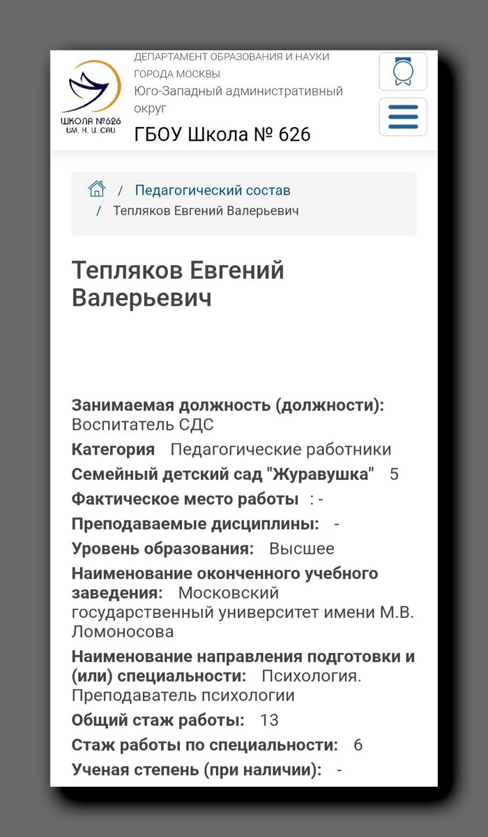 Вот попалась мне на глаза публикация о "многодетном отце",-и там один из его почитателей.-или-одна?,-пишет она под НИКом "Атлас и бархат" ставит в заслугу Теплякову.-и откровенно этим восхищается.-что его фото,-как воспитателя семейного детского сада,- есть на сайте ГБОУ школы № 626 столицы.. И захотелось мне в этот вопрос внести ясность. Итак: воспитатель