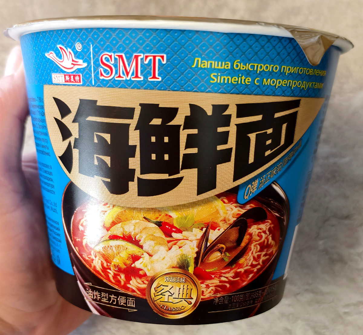 Всем привет! Купил на пробу ещё одну китайскую лапшу бренда SMT (Simeite). Сначала я не заметил никакого подвоха, кроме того что на китайской лапше слишком много русских слов. Лапша с морепродуктами. Упаковка выглядит премиально. Красивая картинка с супом, похожим на Том Ям. Даже золотая медаль присутствует. Крышка из фольгированного блестящего материала. Вот она странность, что на китайской лапше почти все написано на русском. Такое я встречал только на лапше из Светофора. Какие-то псеводкитайские бренды. В общем изготовлена лапша как будто в Китае. Импортер: ООО "ТрейдГрупп" г. Владивосток. Состав дикий. Химические элементы везде. В приправе нет ничего рыбного. Каким образом они хотят дать вкус морепродуктов?) И вообще там почти ничего нет кроме химикатов. Судя по всему это какая-то опасная бомба. Масса 100 граммов: 85 лапши и 15 добавок. Здесь я обратил внимание на качество печати, как будто на дешёвом принтере распечатывали упаковку. До кучи решили часть информации дать на