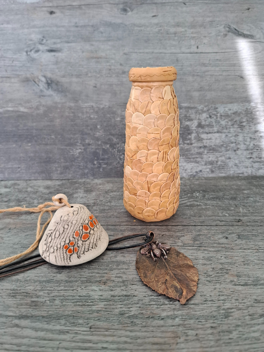 Приветствую читающих. Представляю, сколько человек может подумать, что стоит ли на это дело так заморачиваться. Когда интересно, тогда-да. Чтобы в понедельник рассказать о бересте, страдала ей целую неделю. Можно конечно и быстрей, но я всем занимаюсь по немногу в день. Штук сто , точно не считала, пробила таких кругляшков из бересты. Пробойничек, молоточек и вперед. А потом еще фигурным пробойником все прошлепать, для интереса, узорчик. А вы вообще знаете, что береста после горячей воды тянется? Я не знала и от того более интересны все эти эксперименты. Высыхая, приобретает форму и крепко ее держит. Была простая маленькая бутылка из под сока. А после украшения берестой стала красивой. Потихоньку, кругляшок за кругляшком обклеиваем всю емкость. Крышку тоже обтянула. Пытаюсь показать, как плотно обтянута крышка. Как в черчении три проекции. Правда ракурсы не те, помню еще. Но честно пытаюсь показать со всех сторон. А что правда прикольно? Мне нравиться! Береста воды не боит