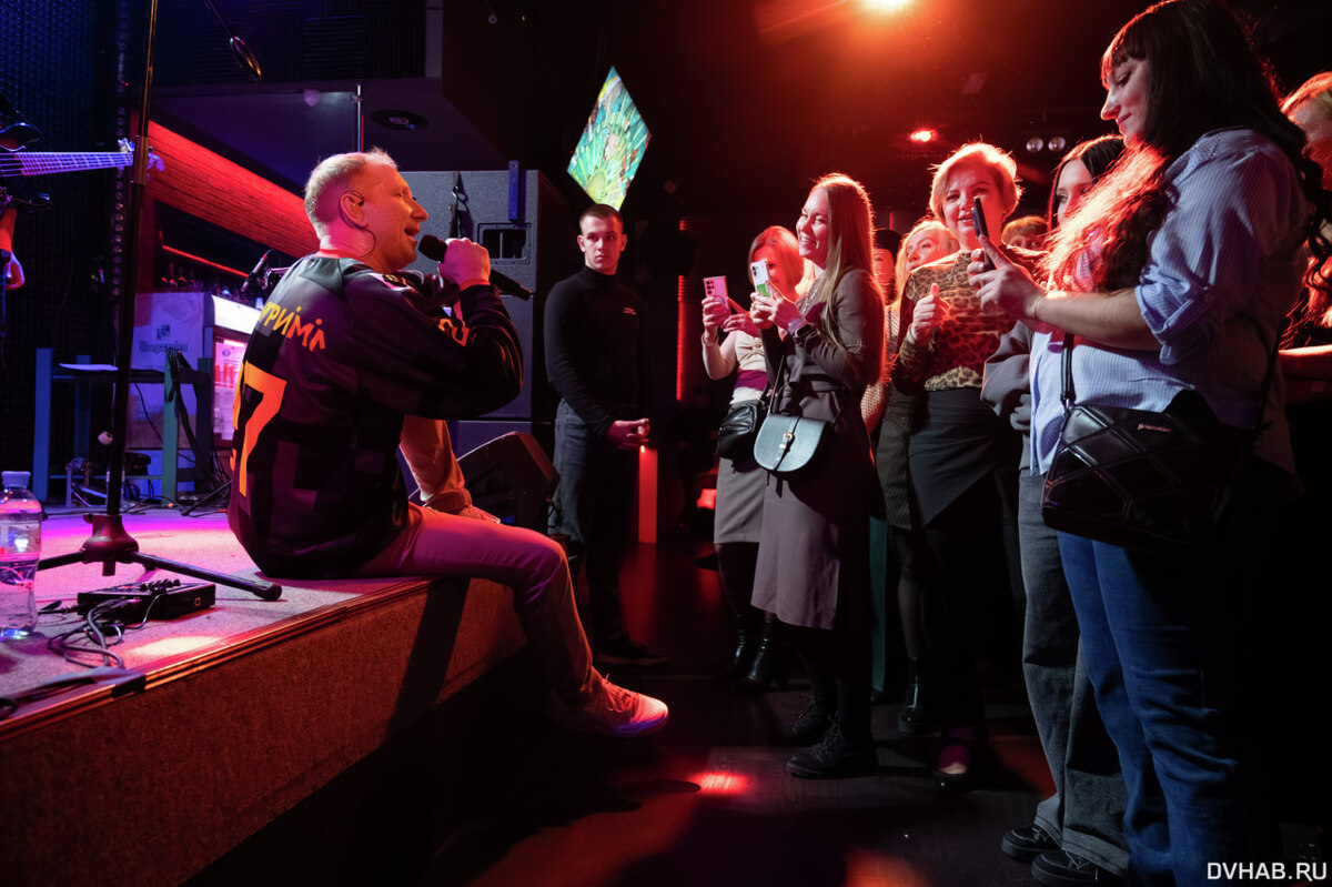 После небольшого тренинга прозвучала композиция «Лелею», а следом за ней музыкант исполнил «Ресницы». В этот вечер также звучали песни «Самолеты», «Лето», «Снег и вечер», «Кустурица» и другие популярные хиты. Хабаровская аудитория знала каждую, подпевая артисту любимые ими песни.