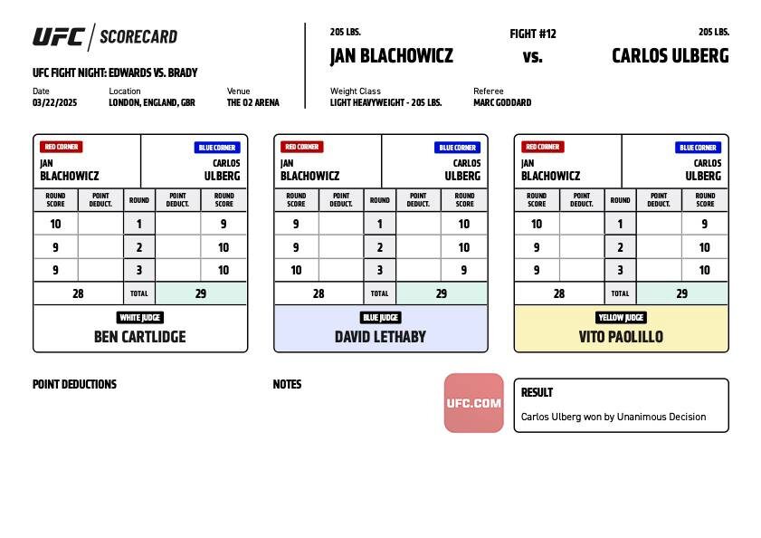 Главная Выгодные цены на бытовую технику Tuvio на Яндекс Маркете Google Play Реклама • 16+ Большой ассортимент мебели на Авито Google Play Реклама • 16+ ГлавнаяMMA Результаты UFC Fight Night 255: Брэди досрочно победил Эдвардса, Блахович проиграл Ульбергу Результаты UFC Fight Night 255: Брэди досрочно победил Эдвардса, Блахович проиграл Ульбергу 23 | Март | 2025 02:46 2 Автор: Б. Панчин В столице Великобритании Лондоне завершился турнир UFC Fight Night 255, в главном поединке которого экс–чемпион UFC в полусреднем весе Леон Эдвардс потерпел досрочное поражение от Шона Брэди. Ключом к успеху Брэди, занимавшего на момент боя пятую строчку рейтинга полусредневесов, стало его превосходство в борьбе: начиная со второго раунда, поединок проходил преимущественно в партере, где Эдвардс мало что мог противопоставить своему сопернику. В четвертом раунде Брэди в очередной раз перевел Эдвардса в партер и на этот раз сумел забрать его шею в гильотину, вынудив экс-чемпиона сдаться. Во втором