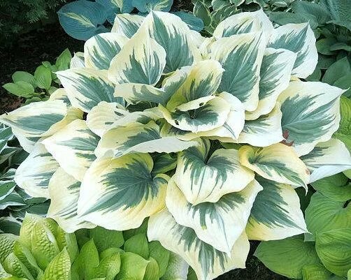 Средние хосты (25-45 см) — самые популярные. Они не занимают много места, но уже создают заметный эффект в ландшафте. 'June' с сине-зелёными листьями с кремовым центром, 'Fire and Ice' с белыми листьями и зелёной каймой — эти сорта становятся центром внимания, где бы вы их ни посадили.