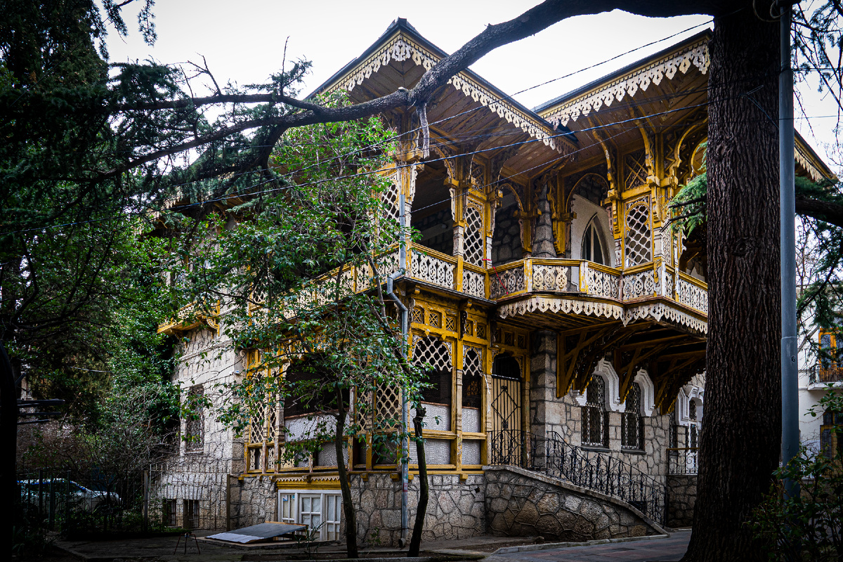Ялта зимой идеальна для прогулок – не жарко и не особо многолюдно за пределами набережной. И главное – огромное количество архитектурных осколков той самой Российской империи. В разной степени сохранности. Неплохо выглядят, как правило здания, в которых обосновались госучреждения, музеи и театры. У них деньги есть, да и надзорные ведомства заставляют. Иногда (но не всегда) санатории. А вот дома, которые в свое время отдали под коммуналки и квартиры выглядят предельно плачевно под наслоениями пристроек, пучков проводов поверх стен, как в Азии, газовых труб и прочих усовершенствований. И только местами сквозь щели в описанном визуальном мусоре проглянет великолепная старая лепнина, барельефы и деревянные кружева.