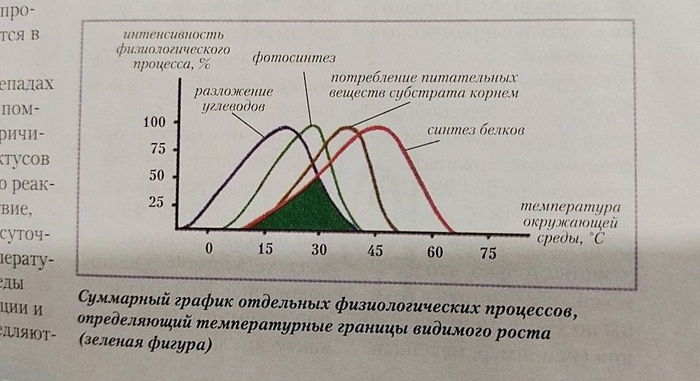Всем мы часто видели утверждение, что перепады температуры полезны для кактусов. Но мало кто объясняет, как же работает этот механизм и почему так. Но все становится понятно, если взглянуть на график из книги "Секреты выращивания кактусов. Гапон В.Н., Батов С.Г. Он показывает зависимость между интенсивностью физиологичных процессов и температуры. И мы видим, что необходимые для роста и жизни процессы происходят при разных температурах. При температуре, где происходит максимальное разложение углеводов синтез белков очень низок. Суточные колебания температуры в течение суток будут стимулировать все необходимые жизненные процессы. Кстати довольно неплохая книга с базовыми знаниями, вполне рекомендую к чтению. В наличие еще есть. Пост автора KorbenCactus. Читать комментарии на Пикабу.