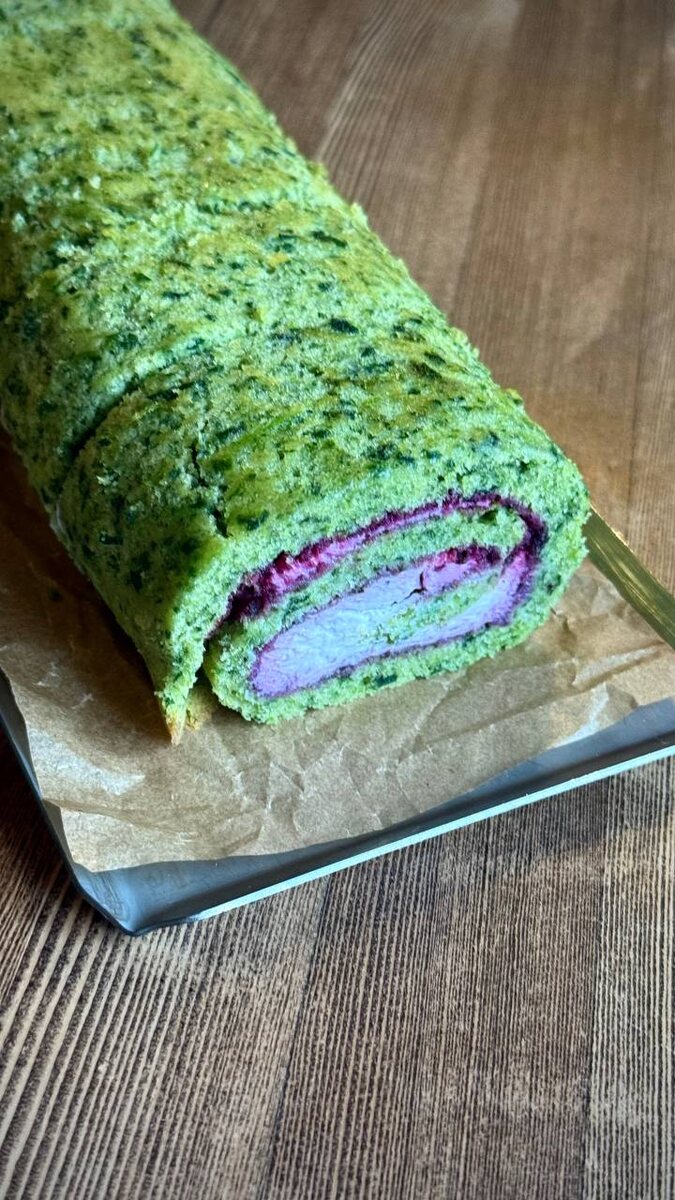 Для всех кому надоели десерты в виде торта посвящается. Что нам потребуется: Для бисквита: - Яйцо куриное 3 шт. - Сахар 150 гр. - Шпинат 200 гр. - Масло растительное 100 гр. - Мука пшеничная 200 гр. - Разрыхлитель 8 гр. -Соль 1 гр. Для крема: - Сливочный сыр 150 гр. - Сливки 33% 150 гр. - Сахарная пудра 35 гр. Для ягодного конфитюра : - Черная смородина 150 гр. - Сахар 30 гр. - Крахмал кукурузный 5 гр. - Вода 10 гр. Начнем приготовление : Для бисквита : смешать яйца , сахар и соль в деже миксера, взбить до белого, кремового цвета. Параллельно взбиванию яичной смеси подготовить шпинат. Погружным блендером измельчить шпинат в растительное масло. Добавить смесь из шпината в яичную смесь и перемешать до однородной консистенции, венчиком на низкой скорости. Далее добавить просеяную муку и разрыхлитель, перемешать до однородности. Тесто выложить на противень с пергаментом и равномерно распределить тонким слоем. В разогретую духовку до 170 градусов поставить бисквит и выпекать 10 мину