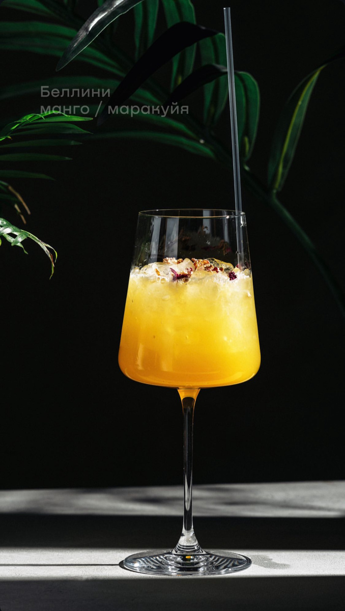 История коктейля Беллини Манго-Маракуйя Классический Беллини появился в 1940-х годах в Венеции, в знаменитом баре Harry’s Bar. Его создатель, Джузеппе Чиприани, вдохновился картиной венецианского художника Джованни Беллини и соединил персиковое пюре с просекко, создав легендарный аперитив. Современная версия Беллини Манго-Маракуйя родилась как дань тропическим вкусам. Шеф-бариста и миксологи стали экспериментировать с экзотическими фруктами, стремясь добавить яркости традиционному рецепту. Манго принесло сладость и бархатистую текстуру, а маракуйя — кислинку и аромат, превратив коктейль в символ лета и отпуска. Сегодня этот вариант популярен на курортах, пляжных вечеринках и в модных лаунж-барах. Рецепт: Беллини Манго-Маракуйя Ингредиенты(на 1 порцию): - 30 мл пюре манго - 30 мл пюре маракуйи - 10–15 мл сахарного сиропа или мёда (по вкусу) - 100 мл охлаждённого просекко (или другого сухого игристого вина) - Лёд (опционально, для шейкера) - Украшение: долька манго, семена