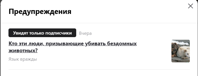 Друзья, к сожалению очень много статей приходится удалять с Дзена с пометкой "язык вражды". Статьи, набирающие десятки тысяч прочтений, вызывающие большой отклик в обществе читают не только сердобольные люди, но и живодёры, догхантеры, охотники, поджигатели приютов. Люди, говорящие на языке вражды, призывающие быть загрызенными, облитыми бензином, оскорбляющие абсолютно незнакомых людей. Люди, привязывающие собак к автомобилям, травящие кошек, стреляющие по птицам, убивающие амурских тигров, пихающие иголки в хлеб лебедям и снимающие их мучения, жалуются, что им кто-то угрожает. Ни в одной из моих статей нет призыва к расправе. Есть призыв к тому, что всё живое на нашей планете заслуживает уважения, будь то бомж или бездомная собака. Разница только в том что бомж сам выбирает свою судьбу, а бездомные животные становятся заложниками человеческого предательства, жестокости и равнодушия. Да, бездомные собаки создают проблемы, и очень серьёзные. Но собаки на улицах по вине людей, и убить и