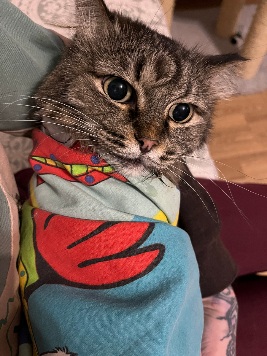 г.Пермь Добрый день, друзья! Я не знаю как мне выразить благодарность за Вашу поддержку, было так много откликов по Мэвис. Вы лучшие! Спасибо, спасибо, спасибо!!! Камень с души, даже настроение поднялось. Сегодня расскажу как проходит реабилитация Азии и Мэвис. Не смотря на всю робость и страх Мэвис ведет себя лучше, мне проще ей проводить процедуры, кушает она сама перетертый влажник. А вот Азия..... дама с огоньком. До чего истеричная среди других кошек. Поскольку восстановление после операции занимает три недели, то всё это время Азия будет находиться у меня. Живя у бабушки она успокоилась, раскрылась и зажила нормальной жизнь, но операция резко изменила обстановку. Вы все знаете, что Азия не терпит других кошек от слова совсем, даже к собакам она на много терпимее. Кормежка и уход за деснами просто кино и немцы. Держу ее в клетке, чаще всего в закрытой клетке. Сама она есть отказывается, поэтому пришлось прибегнуть к насильному кормлению, от чего у Азии еще больше истерика. Без еды