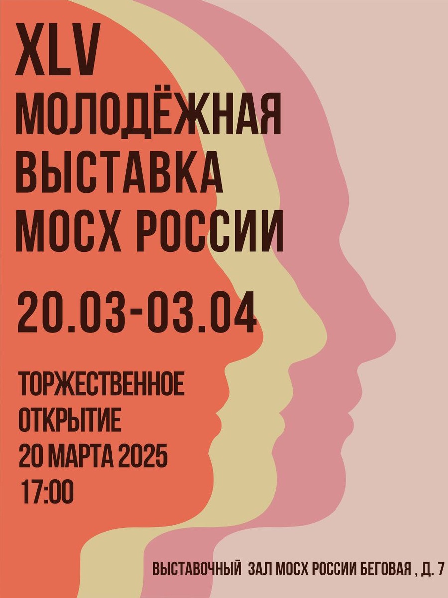 20 марта - 3 апреля 2025 года. На 45-й молодежной выставке МОСХ России в этом году выставляется 368 молодых художников, которые показывают около 170 произведений живописи, более 115 произведений разных видов графики, включая плакаты, иллюстрации к литературным произведениям и эскизы к кинофильмам и театральным постановкам, более 50 произведений станковой скульптуры и мелкой пластики и около 70 произведений разнообразных видов декоративного искусства (стекло, керамику, эмали, текстиль, художественный металл, мозаику). Лучшие из работ выставки по разделам живописи, графики, скульптуры, декоративного и кинодекорационного искусства будут отмечены дипломами МОСХ России и Союза художников России. Каждая из молодежных выставок, состоявшихся в выставочном зале МОСХ России на Беговой, имеет свои неповторимые особенности, но все они представляют многообразие и преемственность современной московской художественной школы, которая формируется сегодня в Московском государственном академическ