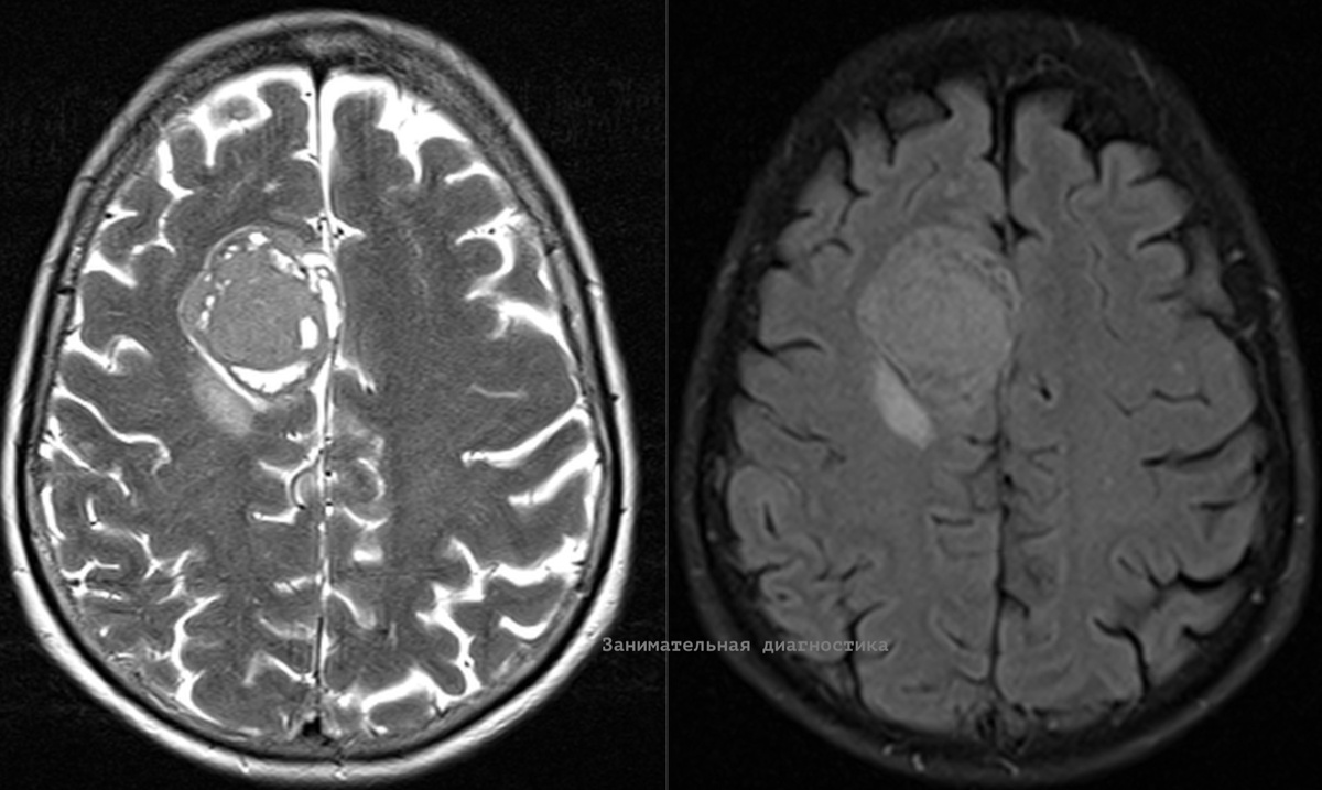 К нам на МРТ обратилась женщина 70 лет у которой ранее обнаружили опухоль на КТ. В таких случаях МРТ назначается для уточнения структуры опухоли и уточнения некоторых других нюансов (для решения по дальнейшей тактике). Образование достаточно крупное, размером с куриное яйцо, оказывает умеренное объёмное воздействие на мозг (масс-эффект). В таких ситуациях рекомендуется выполнение исследования с в/в контрастом. Это позволяет точнее оценить структуру опухоли и часто даже предположить её гистологический тип, что ранее (до эры МРТ) было нереальной задачей. Накопление контрастного препарата интенсивное. Расположение опухоли (она прилежит к твердой мозговой оболочке) и другие признаки позволяют нам на 99% быть уверенным гистологическом типе опухоли, это - менингиома. Менингиомы — это опухоли, которые развиваются из клеток мозговых оболочек, окружающих головной и спинной мозг. Случай интересен ещё и тем, что этих образований у женщины оказалось сразу четыре (!), в разных локализациях. Одно из