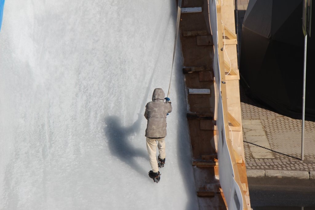 В Нижнем Новгороде продолжается подготовка к соревнованиям по скоростному спуску на коньках на Чкаловской лестнице. Сейчас на трассе намораживают лед. Об этом сообщает корреспондент GIPERNN.RU, посетивший площадку в четверг, 20 марта. 270-метровая трасса начинается под нижним кольцом «восьмерки», делает петлю по откосу, возвращается на лестницу и спускается к подножию. Участникам забега нужно преодолеть препятствия и быстрее соперников добраться до финиша. Перепад высот составляет 30 метров. За пару дней до соревнований ледовое покрытие было готово только в нижней половине трассы: от подъема над парапетом лестницы до финишной площадки у катера «Герой». Как объяснили нам организаторы, лед будет морозиться до самого начала мероприятия. Этап квалификации стартует вечером в субботу, 22 марта. В верхней части трассы продолжают укладывать айс-маты: они используются для заморозки воды. Это система гибких трубок, в которую поступает хладоноситель. Поверх нее послойно заливают воду. Чтобы прове