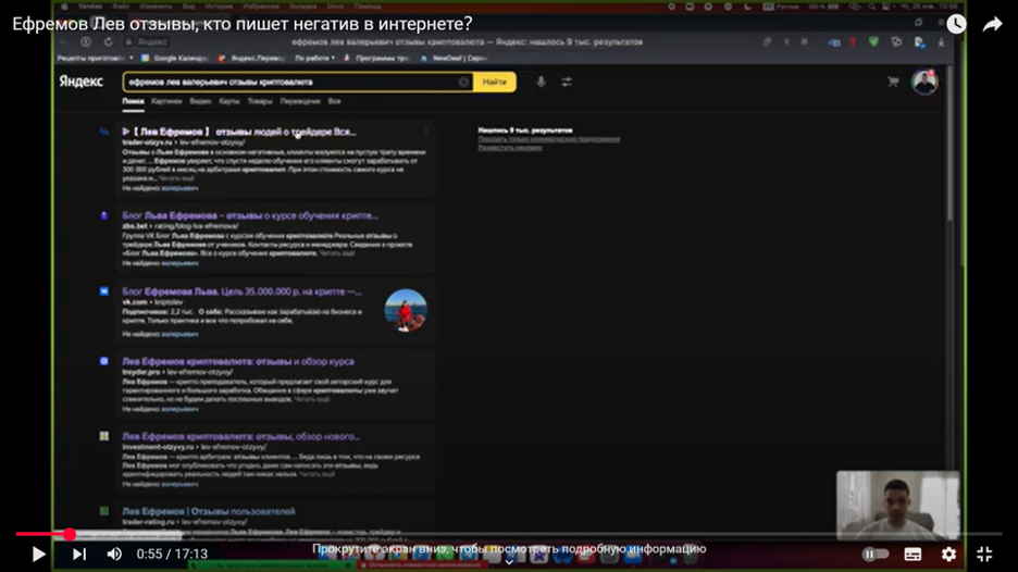 Хочу отметить, что на данный момент есть специальный внутренний чат, в котором я общаюсь со своими учениками по любым вопросам. В нем каждый может высказать свое личное мнение. Но в данном чате нет негативной критики в отношении меня. Чтобы разобраться я набрал в поисковике следующий запрос: Ефремов Лев Валерьевич отзывы криптовалюта.