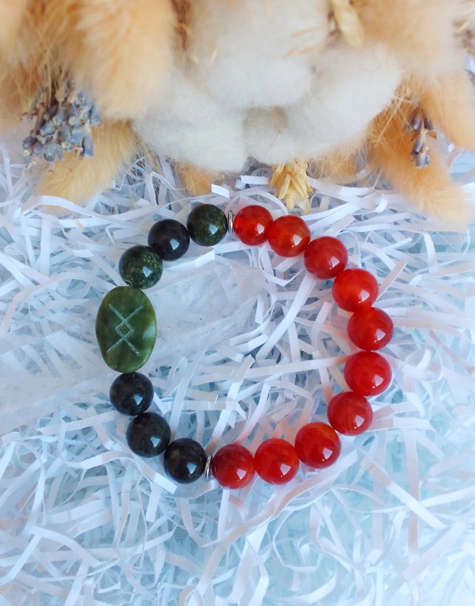 Браслет состоит из натуральных камней змеевика, сердолика и руны «Защита».