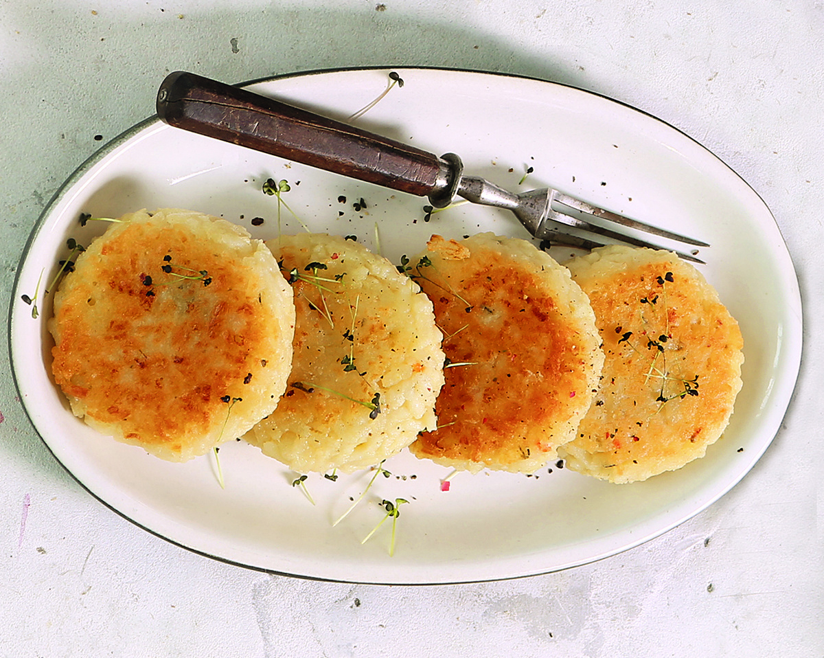Смоченными холодной водой руками сформируйте из риса небольшие котлеты, смажьте их оставшимся миндальным (рисовым) молоком и обваляйте в рисовой муке.