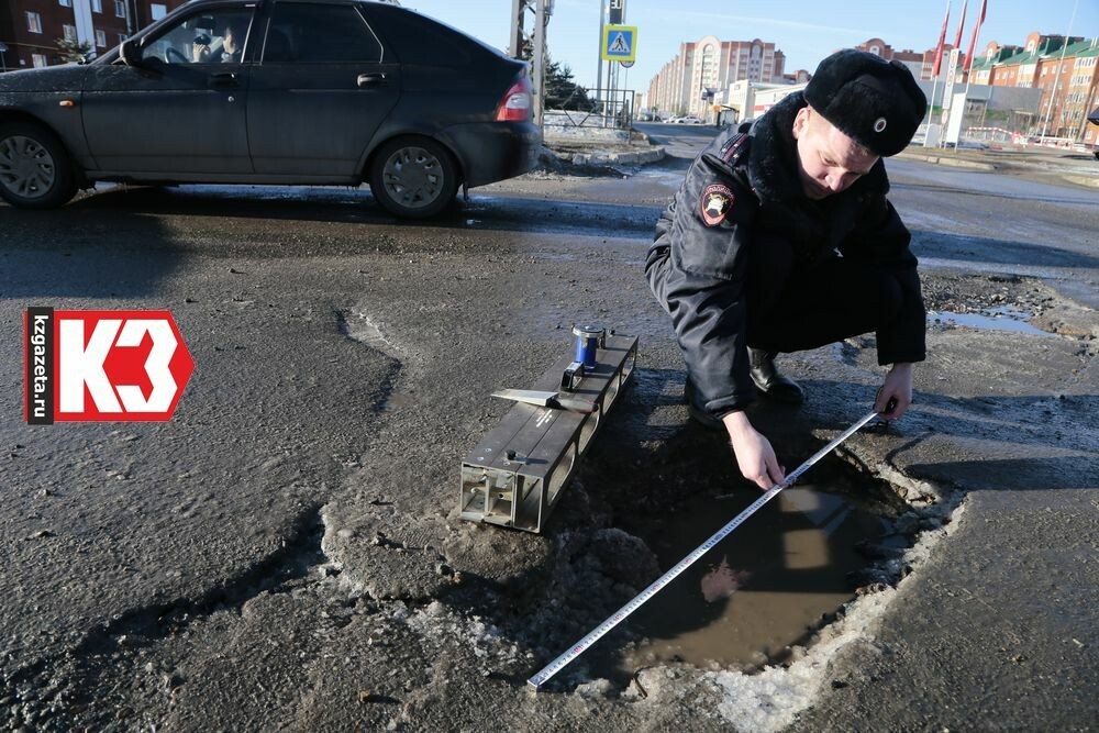 Избитая шутка про «растаявший» асфальт владельцев авто совсем не веселит. Уже есть случаи, когда водители, влетев в ямы, скрытые лужами, были вынуждены менять повреждённые колёса. Сотрудники дорожного надзора Госавтоинспекции Нефтекамска проверяют состояние проезжей части, чтобы указать ответственным лицам на недоработки. Первой точкой стал перекрёсток ул.Карла Маркса и пр.Комсомольского. Здесь выявлены несколько опасных ям. Их глубину измеряют с помощью дорожной рейки. Скажем сразу, что допустима только колея, и то не более пяти сантиметров. Любые ямы и выбоины должны немедленно устранять. И если раньше инспекторы составляли предписание и давали десять дней на ликвидацию повреждений дорожного полотна, то теперь сразу оформляют протокол и назначают штраф. - На постоянной основе сотрудниками Госавтоинспекции Нефтекамска производится выявление недостатков содержания уличной дорожной сети. Сегодня на перекрёстке пр.Комсомольского и ул.Карла Маркса были зафиксированы многочисленные ямы и