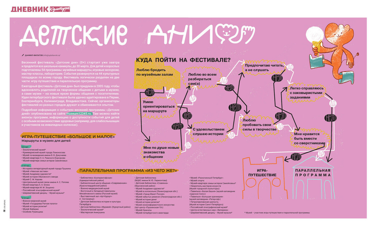 Весенний фестиваль «Детские дни» (0+) стартует уже завтра и продлится все школьные каникулы, до 30 марта. Для детей и взрослых подготовлены 54 программы: музейные маршруты, игровые экскурсии, мастер-классы, лаборатории. События развернутся на 44 культурных площадках по всему городу. Фестиваль логически разделен на две части: игру-путешествие и параллельную программу. Ежегодный фестиваль «Детские дни» был придуман в 2005 году, чтобы вдохновлять родителей на творческое общение с детьми в музеях, а сами музеи – на новые яркие формы общения с посетителями. Идея петербургского фестиваля была удачно адаптирована в Перми, Екатеринбурге, Калининграде, Владивостоке. Сейчас организаторы фестивалей из разных городов дружат и обмениваются опытом. Подробная информация о событиях весенней программы «Детских дней» опубликована на сайте museum12345.ru. Там можно найти анонсы программ, информацию о доступности событий для детей с особыми возможностями здоровья (например, для слабослышащих и участников