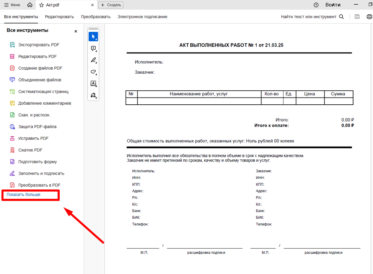📅 Актуально на 21 марта 2025 года Сегодня мы рассмотрим достаточно простую задачу - как поставить печать с электронной подписью (штамп) на файл PDF. Процесс установки нужных программ в данной статье пока не рассматривается. 1. Откройте нужный файл в Adobe Reader. Выберите в левом меню пункт "Показать больше" (см. скриншот) 2. В раскрывшемся списке выберите "Использовать сертификат" 3. Далее выберите "Поставить цифровую подпись" 4. Появится сообщение о том, что вам нужно выделить мышью область для размещения штампа. 5. Поле для штампа можно выделить в любом месте документа. Т.к. речь идет об электронной подписи, то попадать в традиционное "место печати" необязательно. Далее вы увидите меню со списком установленных на компьютере сертификатов ЭП (у меня только один). Выбираете нужный сертификат ЭП, ставите галочку в "Визуализация подписи в соот