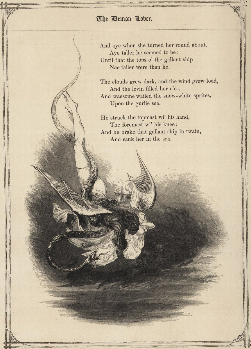— Скажи, какие там встают Угрюмые хребты? — То горы ада! — крикнул он. — Где буду я — и ты! Р. Бёрнс, "Демон-любовник" В поэтическом сборнике Роберта Бёрнса нашла обработанную им англо-шотландскую народную балладу "Демон-любовник". У баллады множество вариаций, и впервые задокументирована она была в середине XVII века. В версии Бёрнса дьявол под видом бывшего возлюбленного обольщает женщину и склоняет её уплыть с ним далеко-далеко. Женщина так ослеплена дьяволом, что забывает и про своего супруга, и про своих детишек. Частенько в ряде версий баллады коварный нечистый заманивает женщину деньгами и драгоценностями. В самой же ранней балладе на этот сюжет рассказывалось о том, как к женщине приходит ее давний возлюбленный и уговаривает ее отплыть с ним в райские земли, которые, по итогу, оказываются адскими хребтами, а сам любовничек — дьяволом, который увеличивается в размерах и топит корабль (собственно, Бёрнс на этот вариант и ориентировался). Баллада отзывалась на давний сюжет и