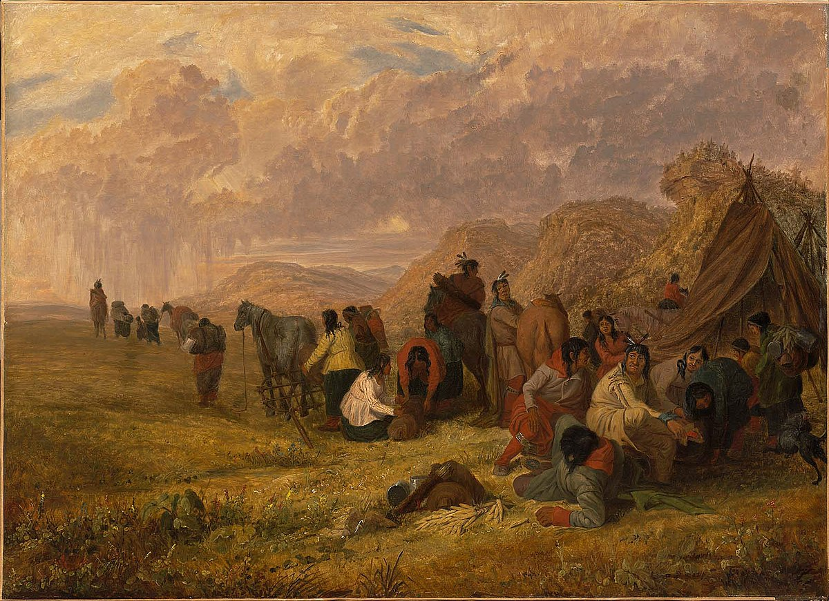 «Многочисленная индейская группа на марше представляла собой впечатляющее зрелище. Каждая семья владела одной или несколькими небольшими лошадьми, к каждой стороне седла которых были привязаны концы шестов, в то время как другие концы шестов волочились по земле. Между собой шесты имели своего рода корзины, сделанные путем плетения кожаных ремешком, прикрепленных к шестам. Маленький ребенок или даже два располагались поверх всего груза. Лошадей вели в поводу женщины, в то время как пожилые мужчины возглавляли всё шествие. Одна семья за другой шли по бокам процессии, но отдельными группами, поэтому колонна была вытянута на большую длину. Когда они достигли ручья, которые необходимо было пересечь, женщины поместили груз себе на плечи. Тамошние потоки, как правило, быстрые, но не глубокие, редко когда доходят до талии, и то, только в период паводков. В этот момент наставало время любимого развлечения для молодых людей, когда они располагались вдоль берега и делали недвусмысленные намеки насчет оголенных лодыжек женщин и девушек. Матери и другие родственницы молодых девушек, разозленные таким чересчур дерзким развлечением, забросали назойливых молодых людей камнями и палками, вынудив их оставить свое занятие. Когда колонна достигла места разбивки лагеря, лошади были разгружены и отведены на пастбище, а затем женщины очень быстро возвели жилища, в то время как мужчины, по крайней мере, те из них, которые не отправились на охоту, сидели в тишине и курили свои трубки. Задача мужчины заключается в том, чтобы обеспечить обитателей жилища едой и одеждой, женщина должна была делать всё остальное. В действительности, женщине было бы очень стыдно, если бы ее муж вдруг занялся любой хозяйственной работой по лагерю