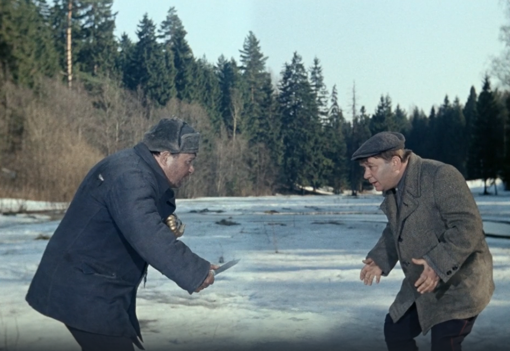 Привет, друзья! На связи Александр, и вы на канале "Заметки Инсайдера". В финале фильма “Джентльмены удачи”, пока Хмырь и Косой спорили между собой о том, кто будет нырять в прорубь за шлемом, на озере неожиданно появился настоящий Доцент. Вытащив нож из внутреннего кармана пальто, он приказал Косому лезть в воду. Спустя мгновение шлем Македонского был уже у него в руках. Завладев реликвией, Доцент попытался ретироваться, однако его вдруг окликнул Трошкин. Далее мужчины вступили в схватку, в ходе которой уголовник Белый чуть не пристрелил Евгения Ивановича. Как вы считаете, почему Доцент ни грамма не смутился, увидев на берегу озера своего двойника? И что за пистолет он направил на Трошкина после того, как Евгений Иванович выбил ногой нож у него из руки? На эти вопросы я отвечу ниже. В конце статья я рассчитываю на вашу помощь в прояснении кое-каких моментов. Приятного чтения! Белый уже был наслышан о Трошкине, поскольку ранее он наведался в гости к Митяю, где, кстати, также находился
