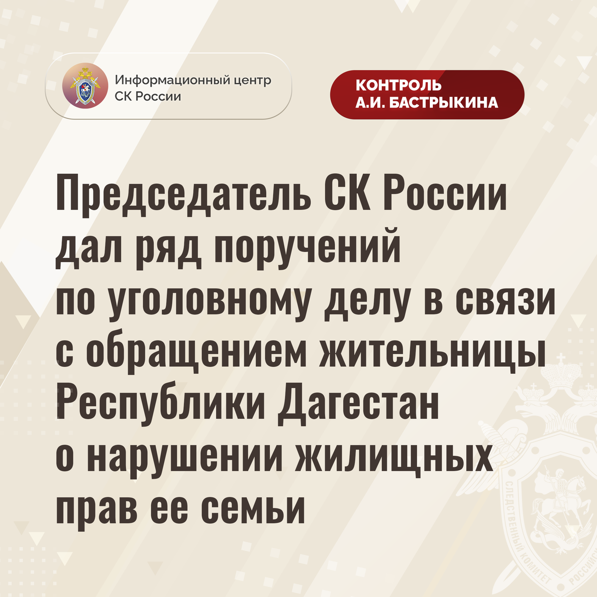Председатель СК России дал ряд поручений по уголовному делу в связи с обращением жительницы Республики Дагестан о нарушении жилищных прав ее семьи В Информационный центр СК России обратилась жительница Республики Дагестан по вопросу нарушения жилищных прав ее семьи. С 2007 года женщина со своим 25-летним недееспособным сыном-инвалидом и 24-летней дочерью состоит на учете лиц, нуждающихся в обеспечении жилыми помещениями, однако до настоящего времени их права не реализованы. В результате они вынуждены проживать в малогабаритной квартире пожилой матери заявительницы совместно с семьей ее брата, не обеспеченной жильем после утраты собственной недвижимости при пожаре. Многочисленные обращения результатов не принесли. В СУ СК России по Республике Дагестан по данному факту расследовалось уголовное дело, которое было прекращено. Председатель Следственного комитета Российской Федерации Александр Иванович Бастрыкин поручил руководителю СУ СК России по Республике Дагестан Дмитрию Владимировичу