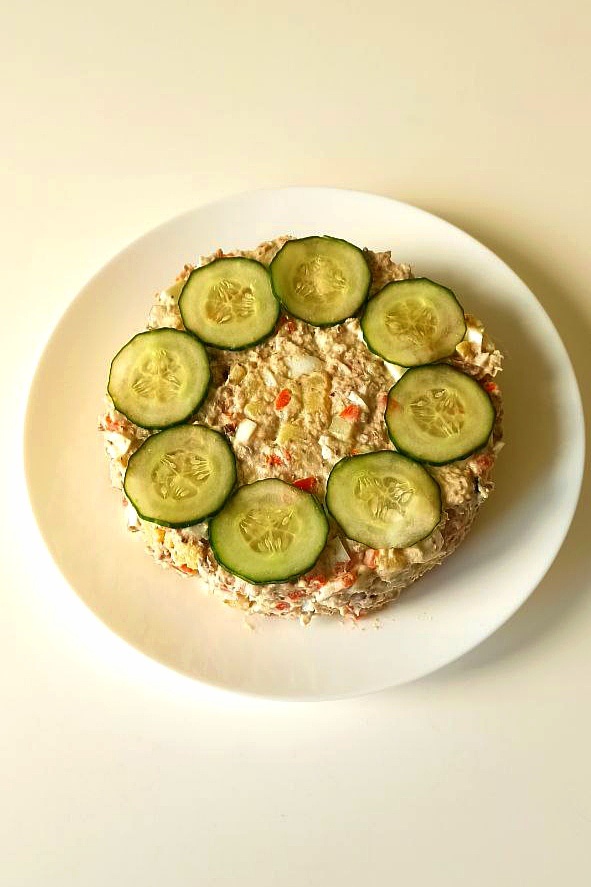 Этот салат легко готовится и отлично подходит для праздничного стола. ### Ингредиенты: - Картофель — 3-4 среднего размера - Морковь — 1 шт. (крупная) - Яйца — 4 шт. - Огурец свежий — 1/2 шт (или по вкусу) - Рыбная консерва (сардина или сайра) — 1 банка (около 200 гр.) - Майонез — по вкусу - Соль и перец — по вкусу ### Приготовление: 1. Подготовка овощей: - Картофель: Помойте и отварите картофель в мундире (в кожуре) до готовности (примерно 20-30 минут). После этого дайте остыть, очистите и нарежьте кубиками. - Морковь: Очистите морковь и отварите до готовности (примерно 15-20 минут). Охладите, нарежьте мелкими кубиками. 2. Приготовление яиц: - Яйца положите в кастрюлю, залейте холодной водой и доведите до кипения. После закипания варите яйца 10-12 минут, затем охладите под холодной водой, очистите и нарежьте мелкими кубиками. 3. Огурцы: - Если огурцы толстокожие, лучше их очистить. Нарежьте огурцы мелкими кубиками. 4. Рыбная консервa: - Откройте банку с консервиров