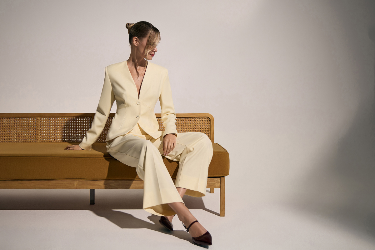 Мягкий, словно тающее сливочное масло, оттенок butter yellow покорил подиумы и вошел в список самых актуальных цветов сезона. В нашей коллекции Verso la primavera он стал одним из ключевых акцентов, ведь в нем есть то самое тепло, которого так ждешь с приходом весны. Созвучный солнечным лучам, погружающий в атмосферу dolce vita оттенок встречается в новой коллекции в костюмной группе: жакетах, жилетах, юбках, брюках, которые будут хороши и соло, и как элементы костюма-тройки. Он легко сочетается с базовыми цветами и в то же время создает интересные комбинации с более насыщенными тонами. Собрали три гармоничных образа, в которых этот оттенок является ключевым. RUBY — оригинальная атласная блуза, которая без труда украсит\ каждый образ, от делового до вечернего. Минималистичную модель мы дополнили застежками на спинке, за счет которых ткань собирается в изящную симметричную драпировку, создавая женственный приталенный силуэт. Собирая весенний образ, сочетаем модель с брюками ELVIN, котор