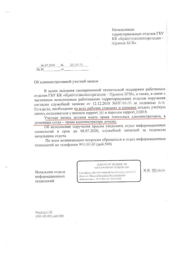 Сегодня, освобождая место на телефоне, разумеется просматривая файлы перед удалением, обнаружил один, как мне кажется интересный, которым хотел бы с вами поделиться. Кто немного в теме, тот понял. Ну а тем кто далек от "компьютерной" тематики, объясню доступно. ГОСУДАРСТВЕННОЕ БЮДЖЕТНОЕ ПРЕДПРИЯТИЕ КРАСНОДАРСКОГО КРАЯ - штат более 1300 сотрудников; 44 территориальных отдела; более 1, 7 млн. единиц хранения в архивах, содержащих информацию об объектах недвижимости Краснодара и Краснодарского края (информация взята с официального сайта учреждения). И на всех рабочих компьютерах и серверах учреждения на протяжении полутора лет одинаковая учетная запись с правами администратора и одним паролем, известным неопределенному кругу лиц... Какая информация и куда за это время утекла - одному богу известно. Для лучшего понимания это можно представить как большой многоквартирный дом с тысячей квартир (рабочие компьютеры) и сотней магазинов на первом этаже (серверы), и у всех одинаковые ключи от вхо