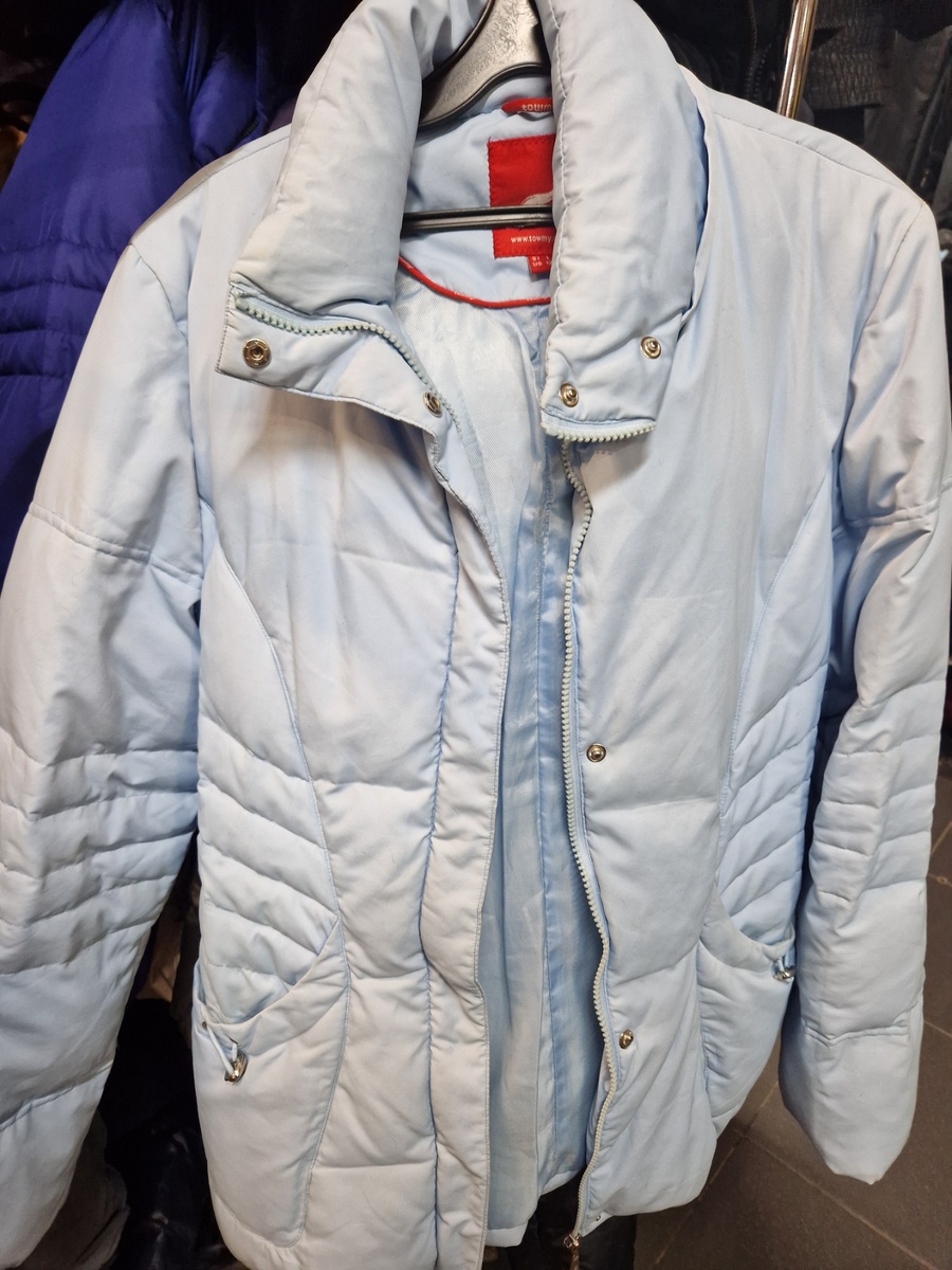 Всем привет! Сегодня мы с вами спускаемся в подземелье одного из секондов, в котором даже в день привоза цены не очень-то и высокие. А так как завтра ожидается новое поступление, то скидка - максимальная, а именно 60%. Давайте посмотрим, что там осталось интересного. Будет немного сборная статья: покажу вещи и просто на плечиках, и буду примерять, а ещё покажу покупки. Сегодня было настроение покупать не себе, поэтому купленные вещи уедут маме и подруге. Все указанные цены - стартовые. От них отнимаем ещё 60% Пуховик Towmy бледно-голубого цвета. Очень хорошее состояние, всё на месте, всё работает, затяжек нет. Освежить - и будет замечательно.