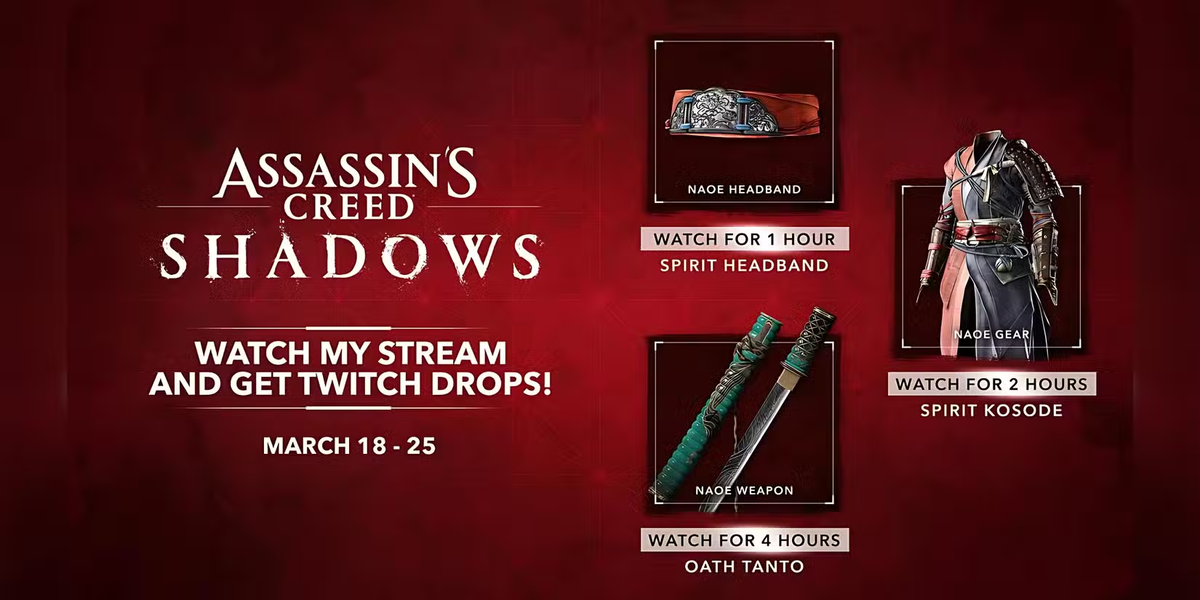 С выходом Assassin's Creed Shadows Ubisoft запустила Twitch Drops, предлагая игрокам уникальные внутриигровые предметы за просмотр стримов. Это отличная возможность бесплатно получить эксклюзивные награды, просто подключив свой Ubisoft-аккаунт к Twitch и наблюдая за трансляциями. 🔥 Список всех наград, сроки проведения акции и процесс получения – в этом гайде! 🎥 Дата проведения: