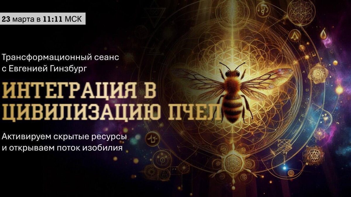 23 марта в 11:11 МСК состоится глубокий энергетический сеанс «Интеграция в цивилизацию Пчёл». 🔗 Принять участие Что даёт этот опыт? 🐝 Цивилизация Пчёл — это не просто мир насекомых. Это мощный поток энергии, где заложены секреты изобилия, гармонии и высшего сознания. Что вас ждёт на практике? 🌟 Активация дремлющих энергий, пробуждающих скрытые способности 🌟 Восстановление генетической памяти о связи с Миром Творцов 🌟 Раскрытие древних сакральных знаний о самоисцелении 🌟 Запуск светового алгоритма исцеления физического и тонких тел Кто может участвовать? Все, кто хочет открыть новые грани своего сознания Те, кто ищет способы глубокого исцеления И те, кто хочет вступить в эпоху лёгкости и потоковой жизни 🔗 Записывайтесь сейчас и позвольте себе пройти этот тонкий и мощный путь!