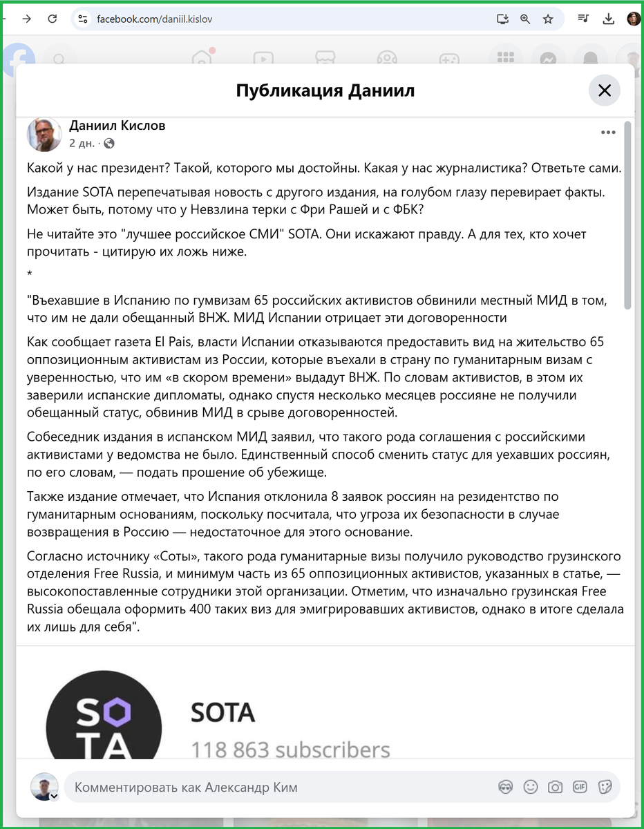 Про гуманитарные визы Испании для российских оппозиционеров и политических активистов, до публикаций 17 марта, я сам слышал ровно один раз. И тут вдруг одновременно всплывает такое количество подробностей по этой, малоизвестной, теме. Вкратце, получатели этих виз оказались в тяжёлой ситуации, поскольку Испания не выдала им ВНЖ, предложив подаваться на международную защиту. А SOTA добавила к этой новости одну маленькую, но любопытную деталь. По сведениям источника Соты: «такого рода гуманитарные визы получило руководство грузинского отделения Free Russia, и минимум часть из 65 оппозиционных активистов, указанных в статье [El Pais], — высокопоставленные сотрудники этой организации». Являются ли эти слова информатора Соты правдой – лично мне неизвестно, но со стороны выглядит довольно странно, что Даниил Кислов (редактор «Ферганы»), обвиняя "Соту" во лжи, не только не приводит никакой аргументации своей позиции, но даже избегает прямо указывать на то, что именно в его понимании является "