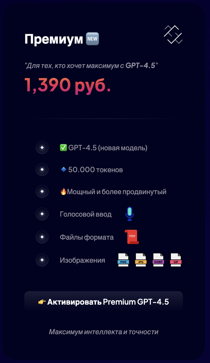 🤖 Что умеет GPT-4.5 и почему это важно? Совсем недавно мы подключили на сайте новую модель — GPT-4.5. Это улучшенная версия GPT-4o, с более высокой точностью, скоростью отклика и возможностью удерживать контекст даже в больших диалогах. Модель уже доступна в новых тарифах: