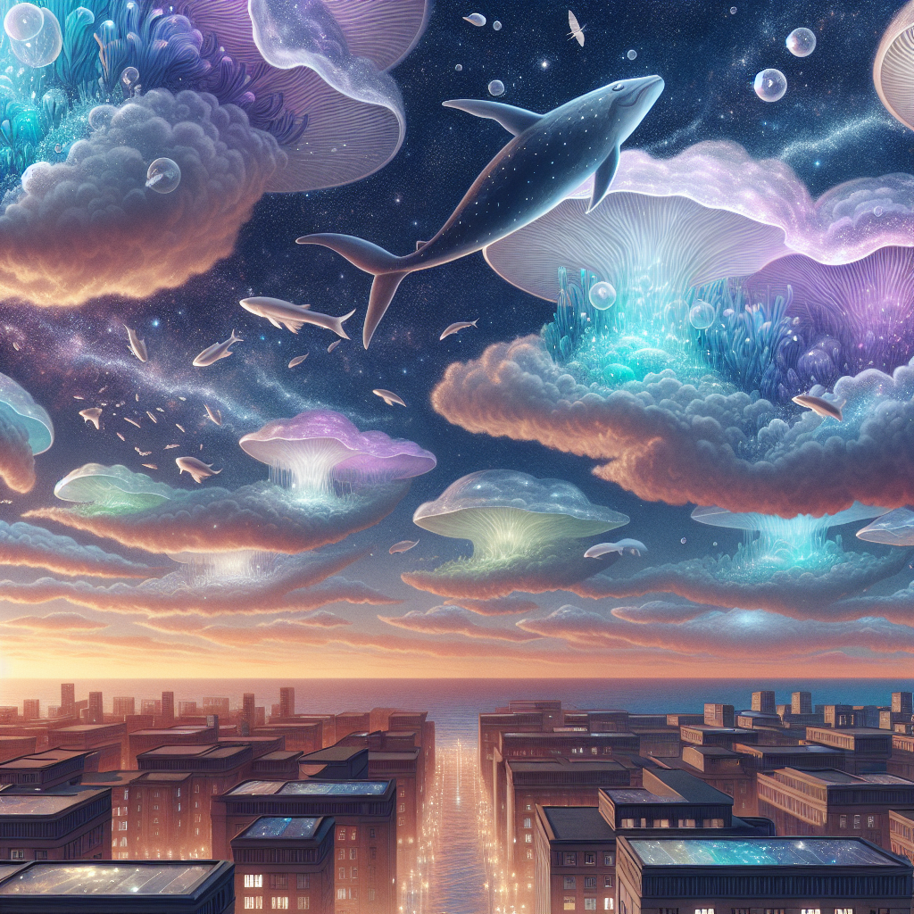 Представь себе океан, но не под ногами, а над головой: небо здесь расцвечено гигантскими коралловыми рифами, которые светятся мягкими оттенками лавандового, бирюзового и золотистого. Они пульсируют внутренним светом и изменяют цвет в такт невидимым течениям небесных потоков. Среди них неспешно проплывают воздушные рыбы с прозрачными, искрящимися плавниками, а иногда в лучах света появляются огромные существа, напоминающие небесных китов — их тела кажутся созданными из тёмного бархата, усыпанного звёздной пылью. Город, расположенный под этими небесами, наполнен домами с стеклянными крышами, сквозь которые можно видеть бесконечное течения звёздных рек на высоте.